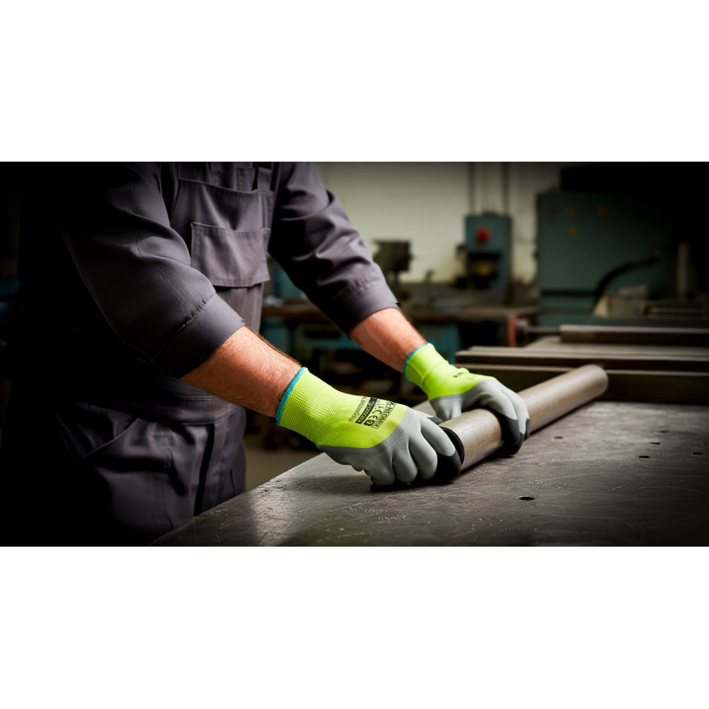 Rukavice X-LATOS NEON vyrobené z polyesteru v žiarivo zelenej farbe, v úchopovej časti potiahnuté latexom s hrubou štruktúrou. Ideálne na manuálnu prácu. Veľmi dobrý úchop. Dobre sa prispôsobujú tvaru ruky. Elastické a pružné. Zakončené lemom. CE EN 388. Balenie: kartón 12/240. Farba: zelená/čierna