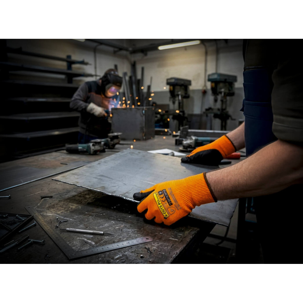 Rukavice X-CUT5 vyrobené zo zmesi HPPE a sklených vlákien s vysokou odolnosťou proti prerezaniu, potiahnuté polyuretánom. Ideálne na manuálnu prácu. Veľmi dobrý cit pre držaný predmet. Chránia pred ostrými predmetmi. Odolnosť proti oderu, roztrhnutiu a prepichnutiu. Dobre sa prispôsobuje tvaru ruky. Zakončené lemom. Vysoký pracovný komfort. CE EN 388:2003 4543, EN 388:2016 4X43D. Balenie: kartón 12/120. Farba: sivá / sivá.